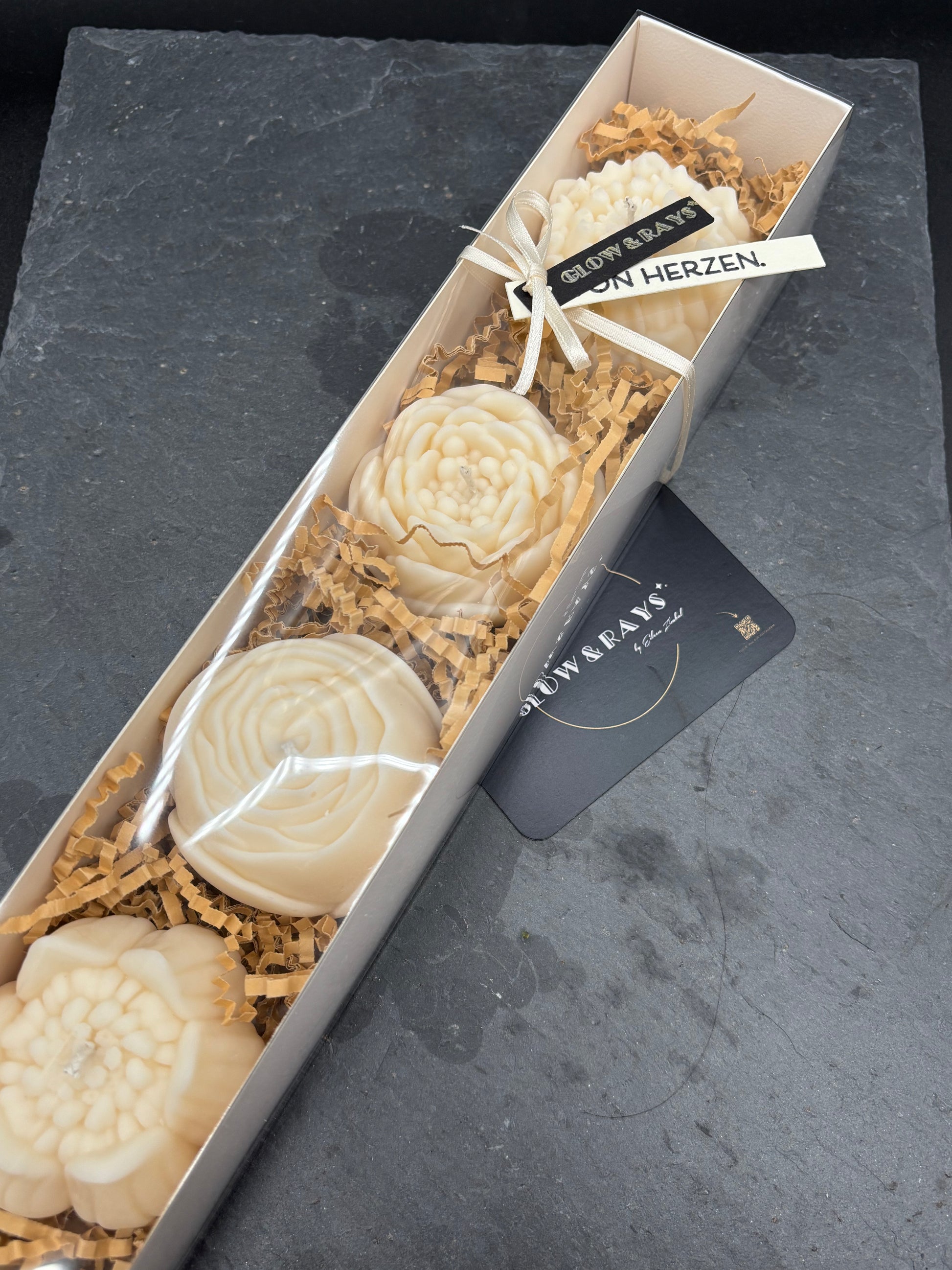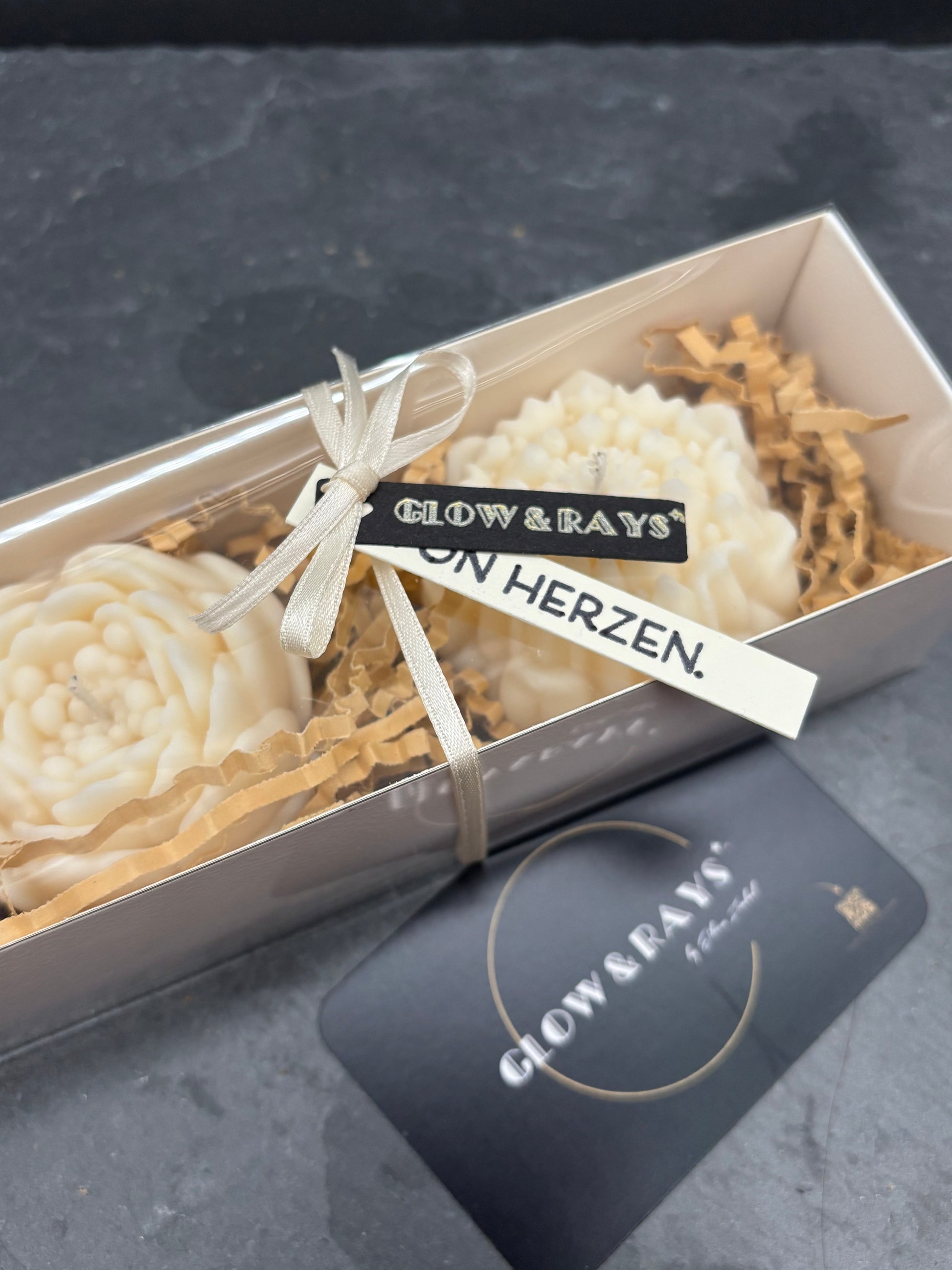 Angezündet entfalten beide Varianten ihre besondere Wirkung. Das Licht scheint durch die Blütenblätter und lässt die Form lebendig erscheinen. Auf einem gedeckten Tisch, auf einer Kommode oder als Geschenk für einen Herzensmenschen entsteht so ein warmer, stimmiger Akzent.