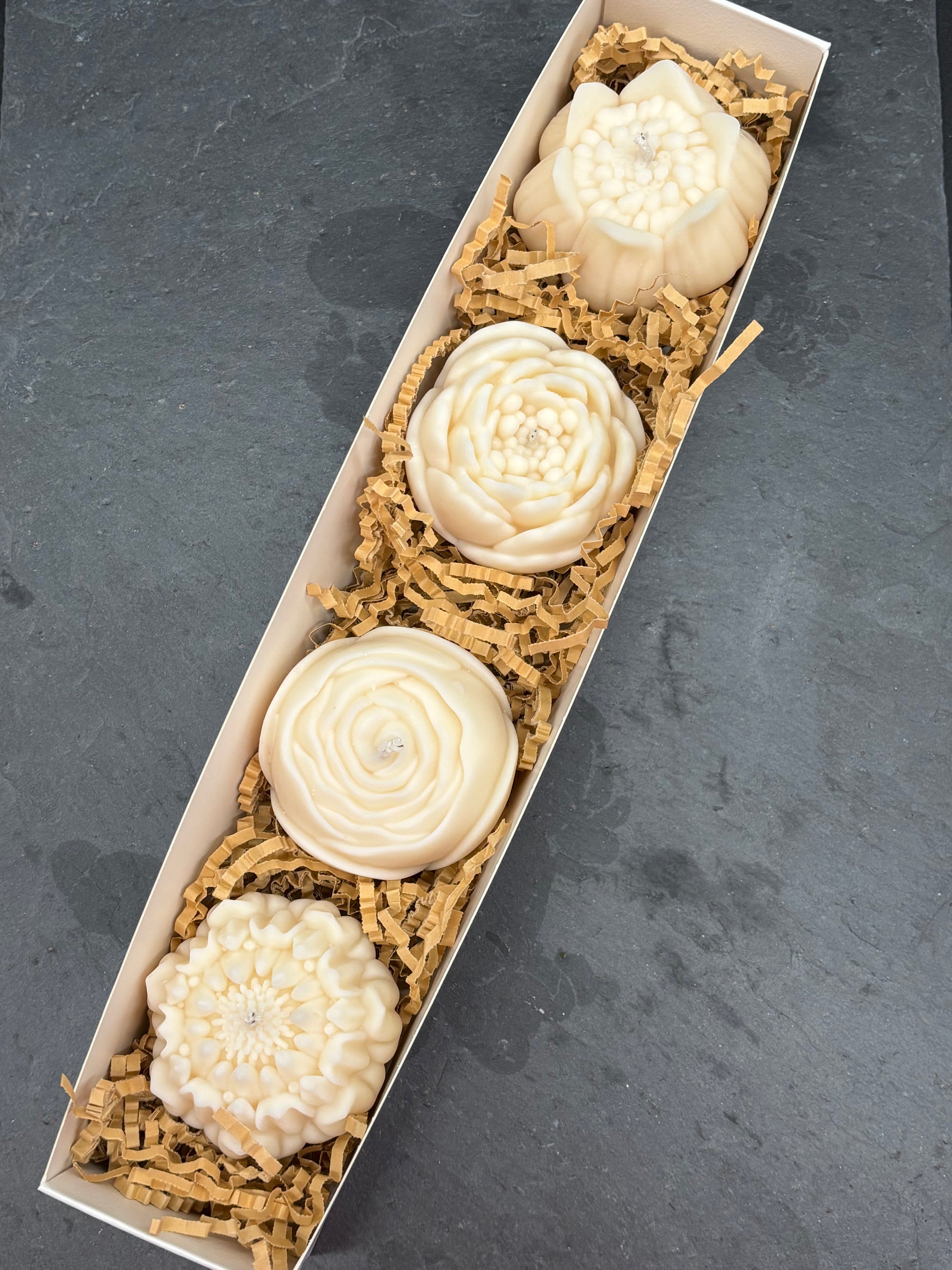 Jede Kerze wird von Hand gegossen. Kleine Abweichungen in Form und Oberfläche gehören dazu und machen jede Blüte ein wenig eigen.