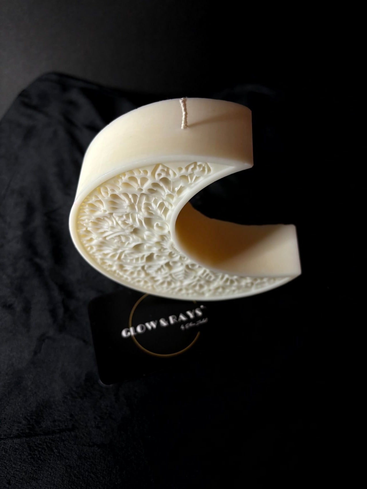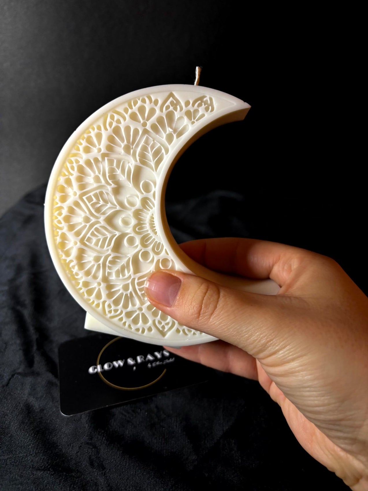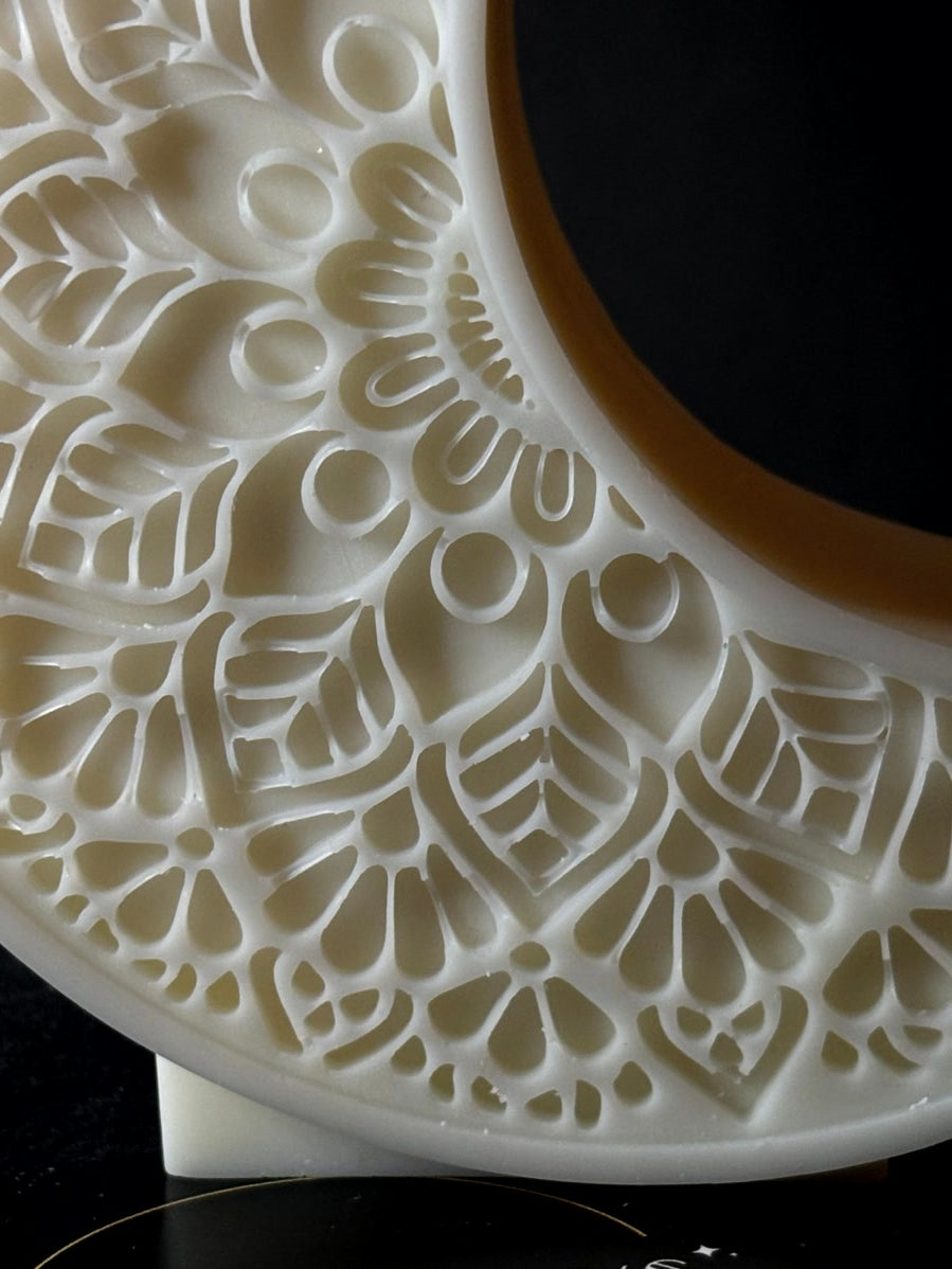 LUNA ist eine Kerze, die sofort eine besondere Stimmung erzeugt. Die feine Halbmondform kombiniert mit dem kunstvoll eingearbeiteten Mandalamuster wirkt wie ein kleines, ruhiges Kunstwerk – detailreich, sanft und gleichzeitig modern.