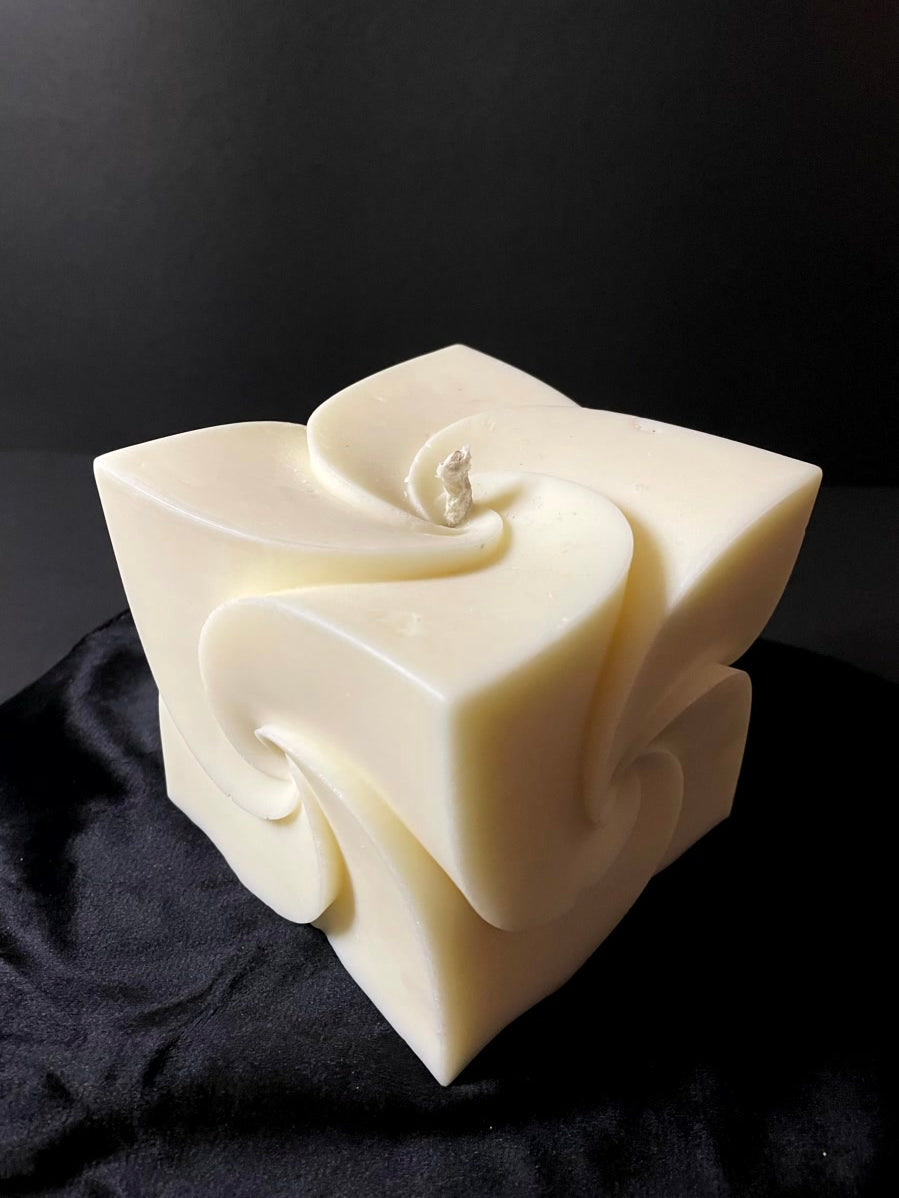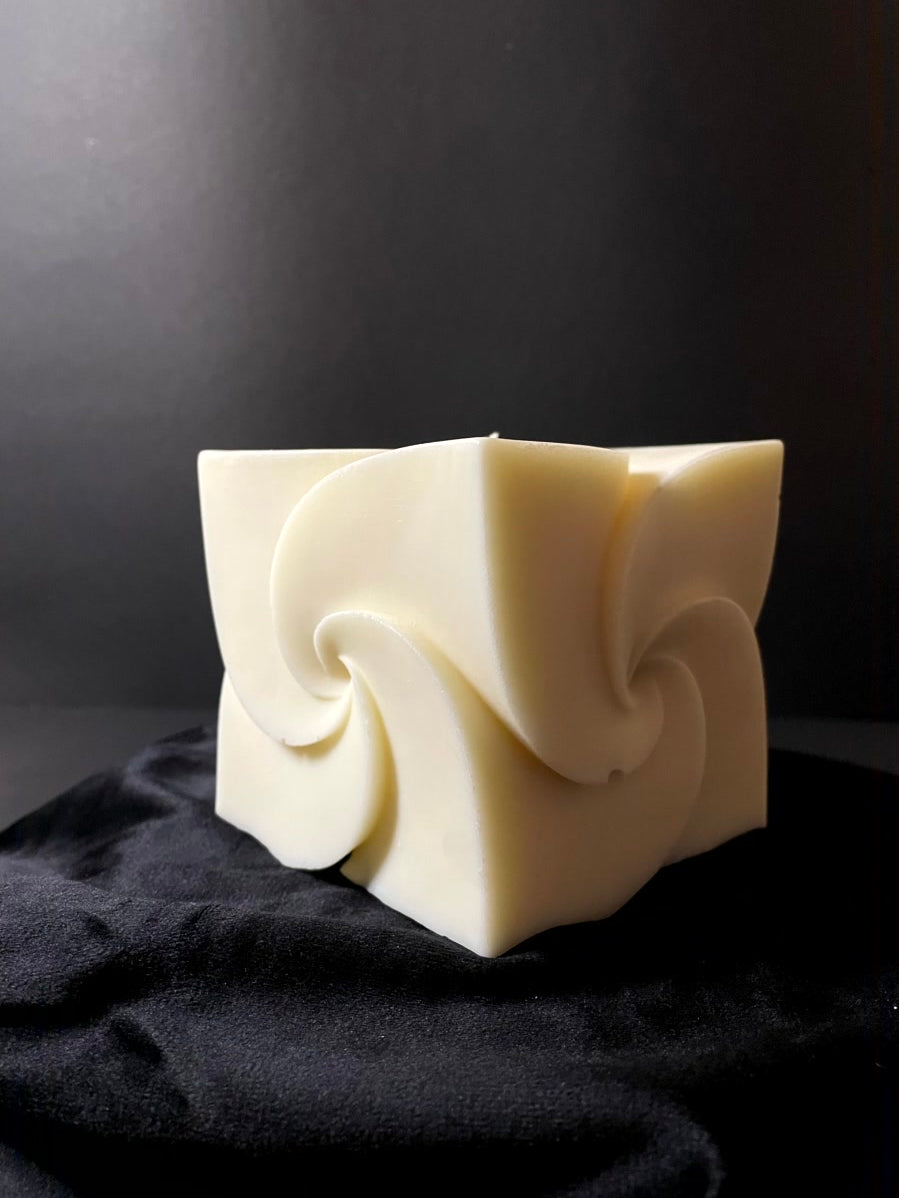 Der klare Würfel trifft auf diese fließenden, spiralförmigen Wirbel, die sich wie sanfte Strömungen über jede Seite legen. Schon unangezündet wirkt er wie ein modernes Designobjekt – geometrisch, ästhetisch, faszinierend.